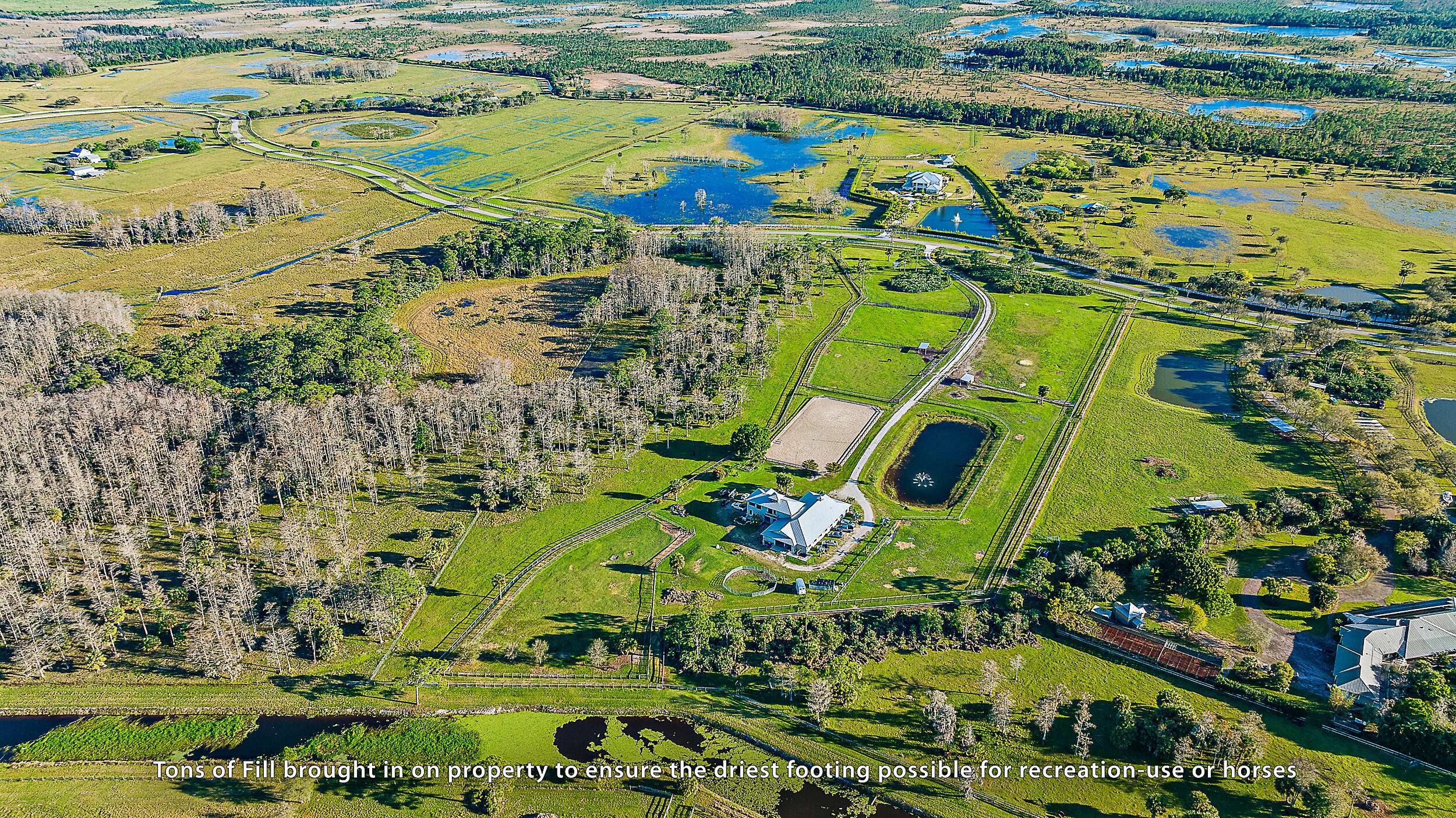 Set on 21.59 acres--approximately 15 usable--within the gated equestrian community of Trailside, this property offers a rare, turnkey equestrian estate. The grounds are fully fenced and cross-fenced, with multiple pastures and paddocks, a fully lit standard riding arena, a round pen, and a private mile long bridle trail. A long private driveway leads to a nearly 5,000 sq ft CBS barn featuring climate-controlled feed and tack rooms.Attached to the barn is a 2,000 sq ft living quarters constructed with rebar-reinforced concrete walls and impact windows and doors, offering 10' ceilings and an upstairs primary suite with panoramic views over the acreage. A designated homesite with underground power is ready for a main residence.The estate is equipped with a whole-house generator with buried