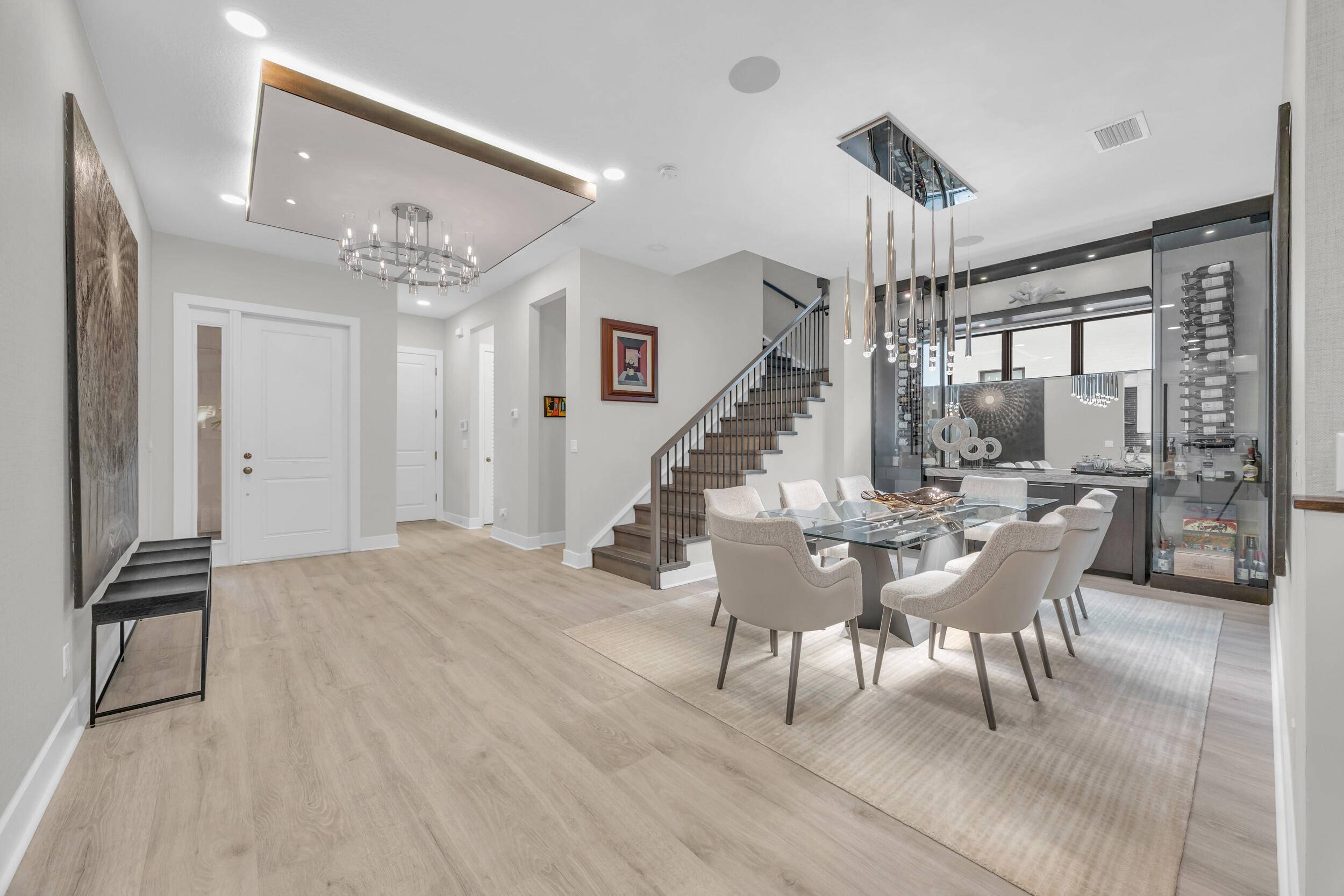 Welcome to the pinnacle of modern luxury in the prestigious, guard-gated community of Artistry. This impeccably designed residence is a masterclass in sophistication and style-showcasing timeless architectural detail throughout. From the moment you enter, you're greeted by a light-filled, open-concept floor plan adorned with rich wood flooring, a dramatic custom great room entertainment center, and expansive windows that bring the lush outdoors in. Every element has been thoughtfully crafted for the most discerning buyer. The formal dining space features a striking custom wine display and bar, setting the tone for elegant entertaining. Just beyond, the gourmet kitchen impresses with top-of-the-line GE Monogram appliances, a gas cooktop, quartz countertops, double wall ovens, a wine