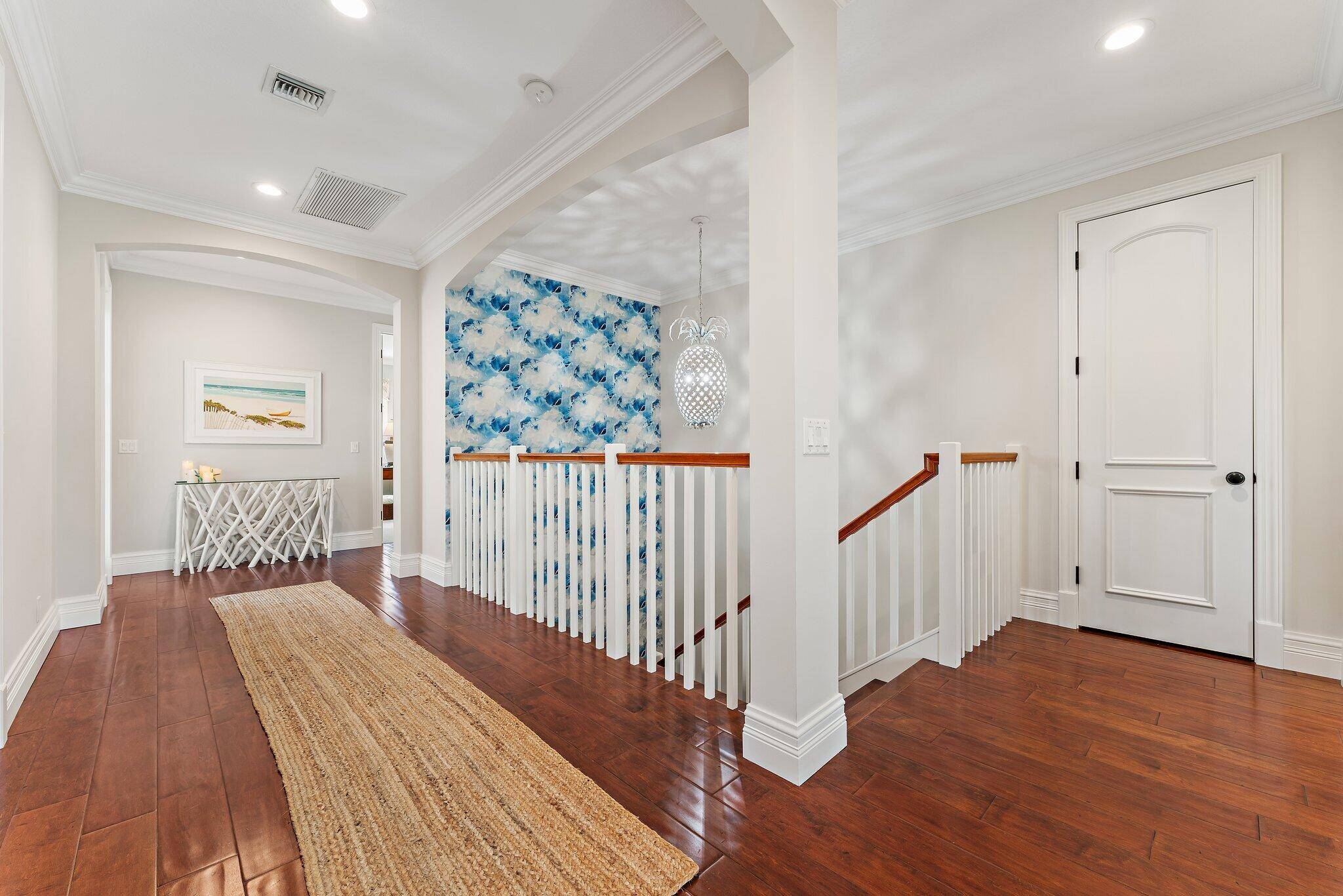Experience year round ocean breezes in this British West Indies inspired beautifully updated 4 BR, 4.5 BA home perfectly positioned 24 feet above sea level across from the Intracoastal Waterway and set on a 3/4 acre lot. Entertain effortlessly in the gourmet kitchen, dining area, and spacious living room, or unwind in the media room and secluded guest suite overlooking the pool and lush backyard.Upstairs, the primary suite is a serene retreat with east and west facing balconies, perfect for capturing sunsets over the treetops. The 2nd floor also includes a private office and two additional en suite bedrooms.Outdoors, the resort-style pool and spa (built 2022) invite relaxation amid lush palms and a privacy hedge, with a covered lanai offering shade and comfort.